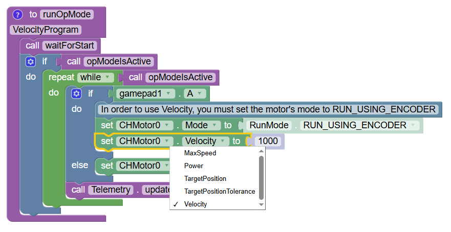 What you want to do is ensure that you connect your motor encoder cable to the robot; if your motor is being controlled by Motor Port 0, then make sure the encoder cable for the motor is plugged into the encoder port just below Motor Port 0. The encoder cable allows the Control Hub to read the encoder in your motor which helps the Control Hub determine how fast the motor is spinning.