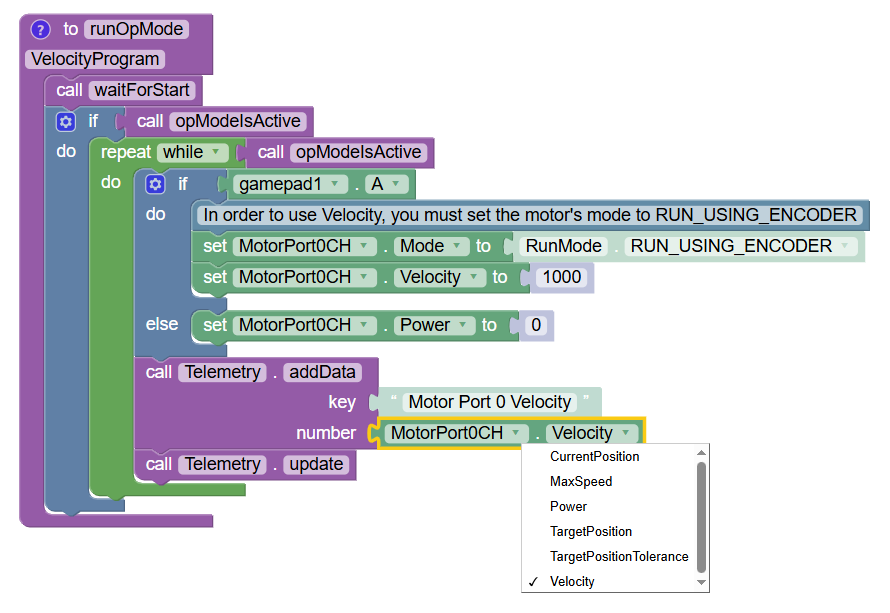 Sure, that’s trivial. Just grab a telemetry block, and plug in the “Get Velocity” block (it’s the “Get Power” block, just change “Power” to “Velocity”).